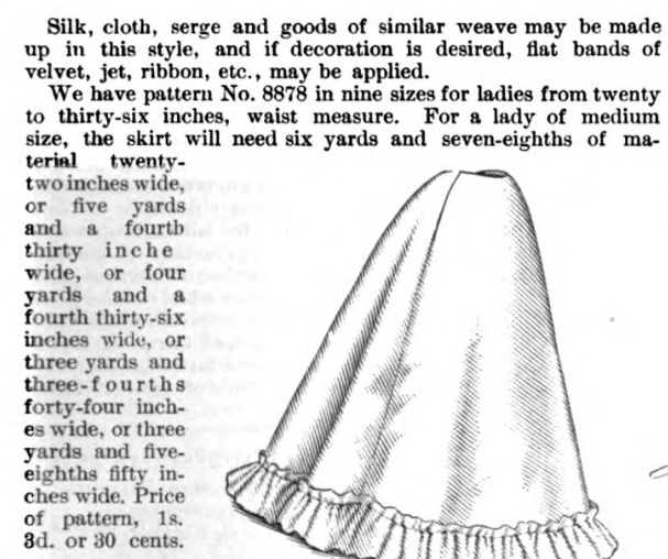 Silk, cloth, serge and goods of similar weave may be made up in this style, and if decoration is desired, flat bands of velvet, jet, ribbon, etc. may be applied. We have pattern No. 8878 in nine sizes for ladies from twenty to thirty-six inches, waist measure. For a lady of medium size, the skirt will need six yards and seven-eighths of material twenty-two inches wide, or five yards and a fourth thirty inches wide, or four yards and a fourth thirty-six inches wide, or three yards and three-fourths forty-four inches wide, or three yards and five-eighths fifty inches wide. Price of pattern, 1s. 3d. or 30 cents.
